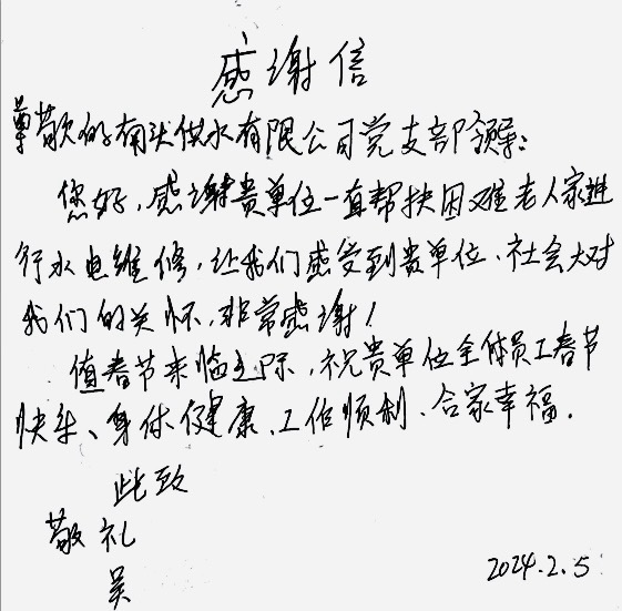 “感謝貴單位一直幫扶困難老人家進行水電維修,讓我們感受到貴單位、社會對我們的關(guān)懷!”吳老太太親筆寫下感謝信。