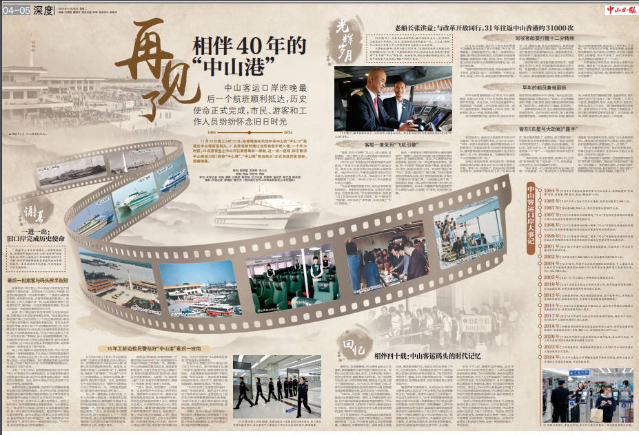 11月25日晚上9時(shí)35分,由香港國際機(jī)場開往中山的“中山20”輪抵達(dá)中山港客運(yùn)碼頭,41名旅客順利通過邊防檢查手續(xù)入境。一個(gè)半小時(shí)前,49名游客坐上中山開往香港最后一班船。這一出一進(jìn)間,標(biāo)志著舊中山客運(yùn)口岸(俗稱“中山港”、“中山港”客運(yùn)碼頭)正式完成歷史使命,圓滿謝幕。